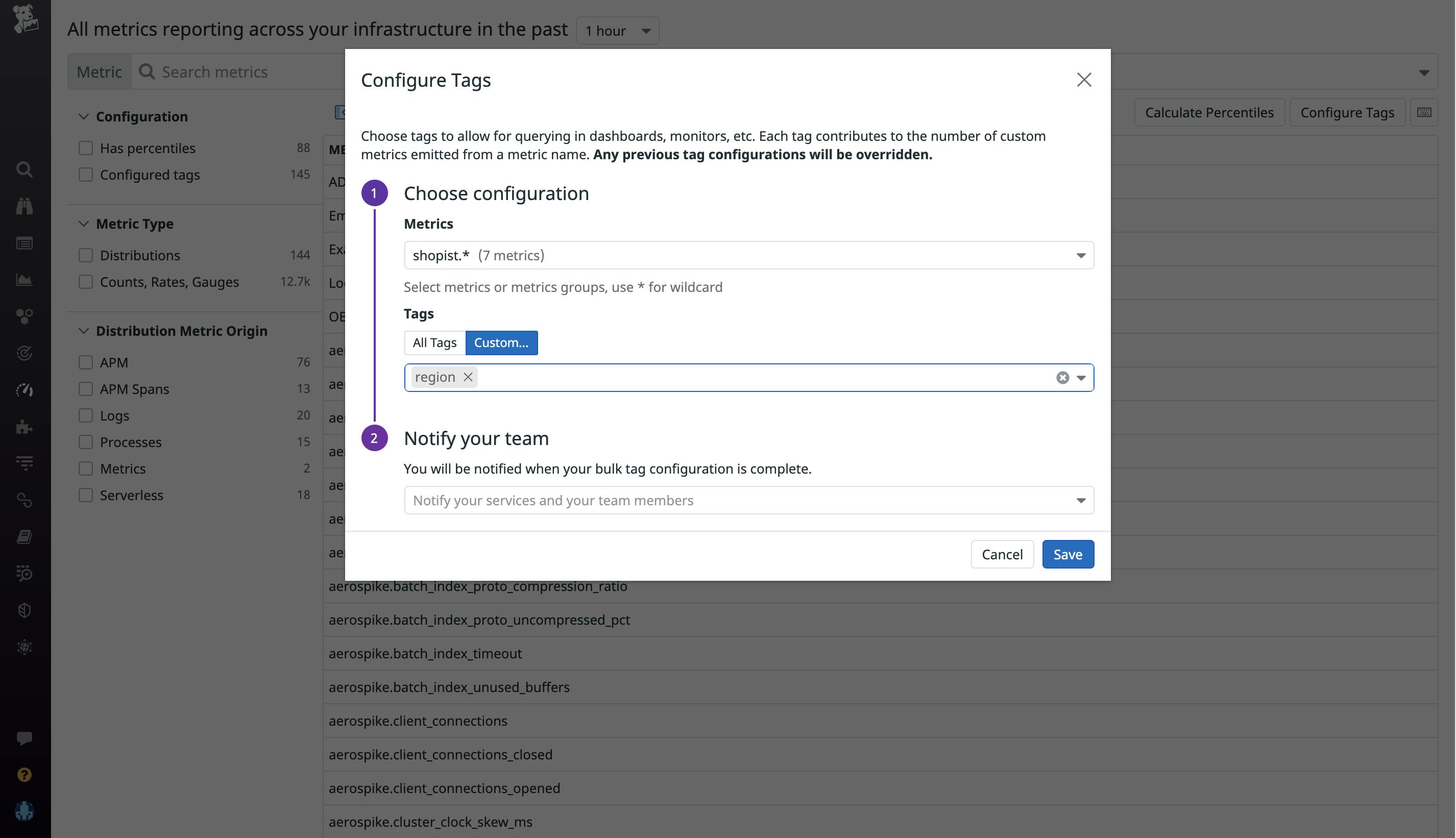 These tags are considered low cardinality because of the broad nature of their classification. If you add an extremely granular tag, such as employee_id, to that same metric,