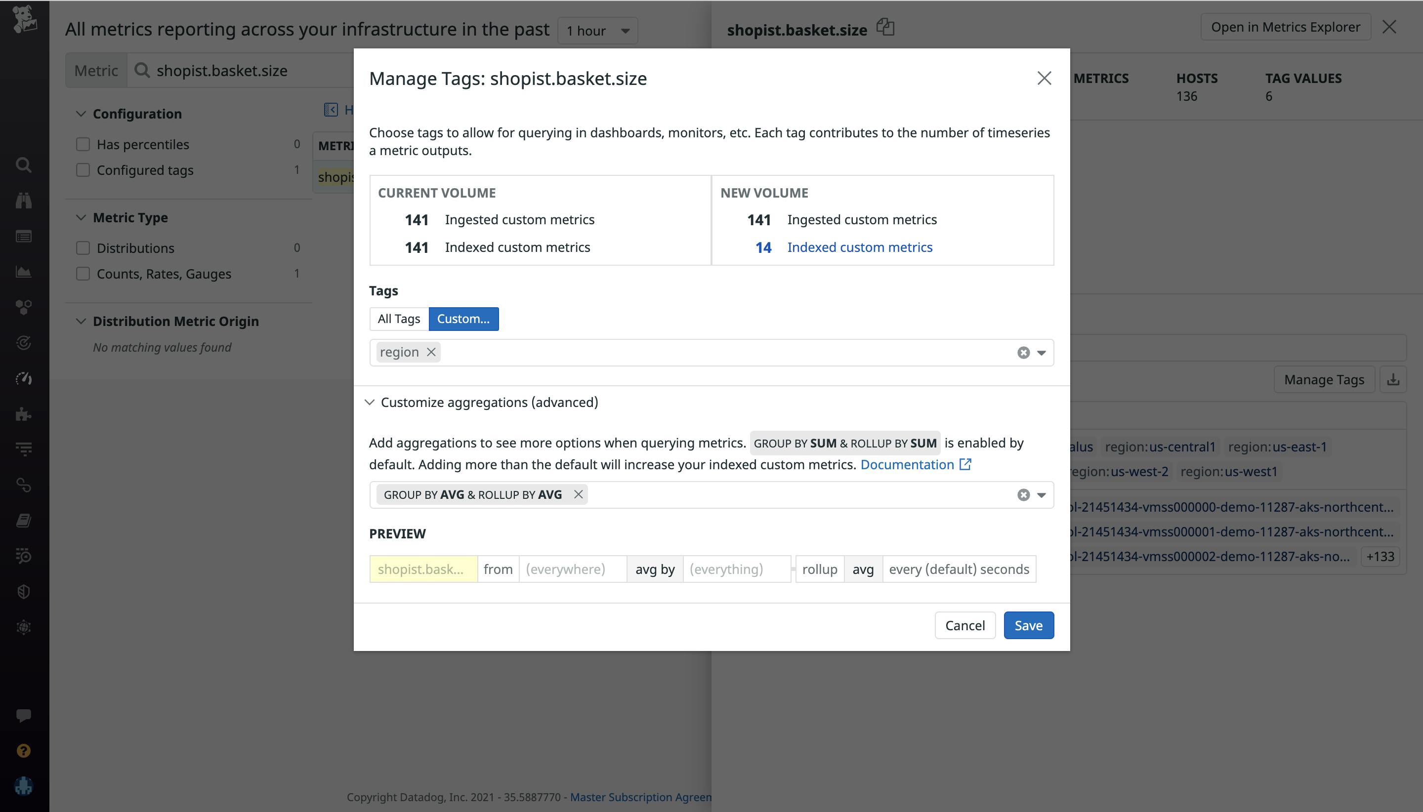 Your count of custom metrics scales with the most granular or detailed tag. Extremely granular custom metrics increase Datadog billing charges.
